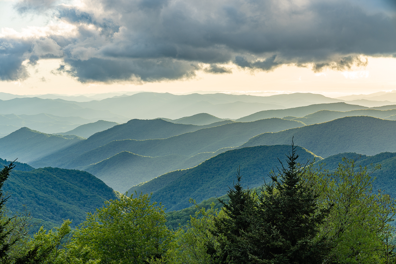 I love good light, and I love good clouds. But I get really ecstatic when I am at high elevation and I see the clouds filtering the light to make magic happen. Such was the case this beautiful day in late May. I was out on the Parkway, primarily looking for the mountain laurel and rhododendron bloom that was just getting underway at high elevation, and had the distinct pleasure of seeing the scene photographed here. It was also exciting for me because it was my first time taking photos from this particular vantage point, but now this spot will stay high on my list of possible destinations.