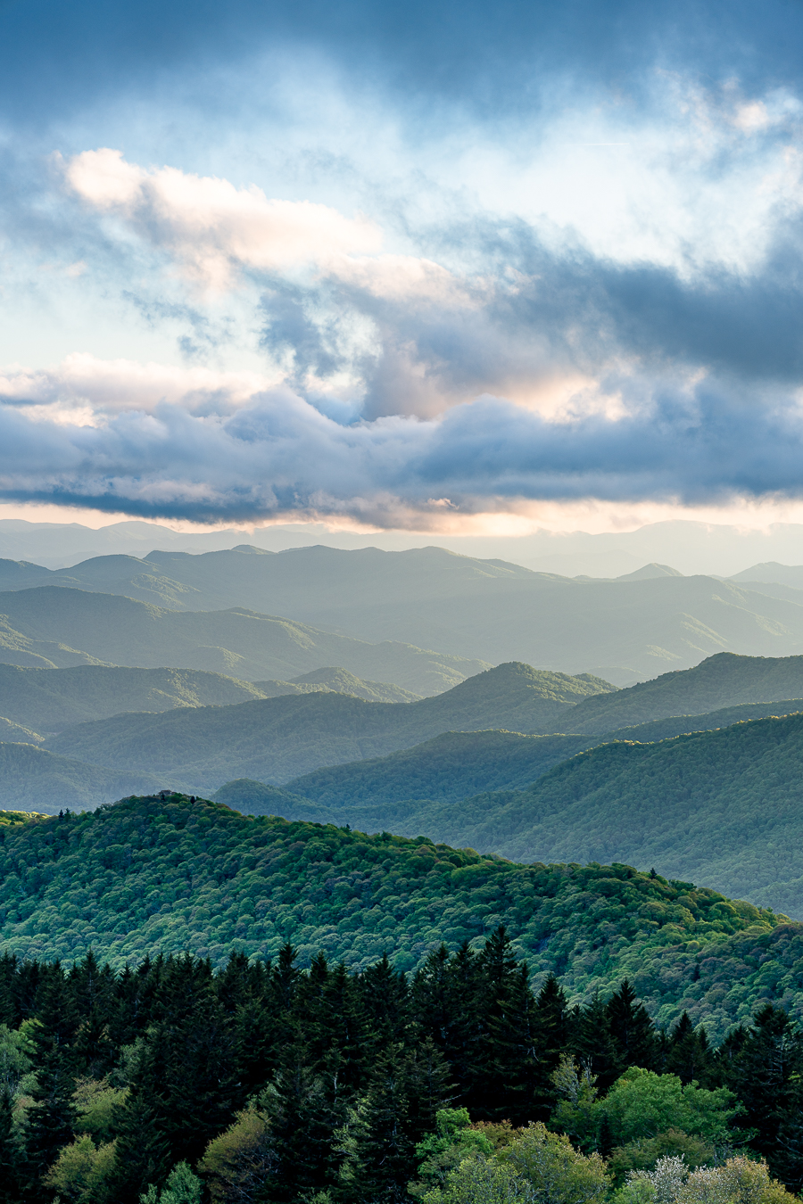 Pretty clouds over numerous mountain layers in Pisgah National Forest, as viewed from the Blue Ridge Parkway.