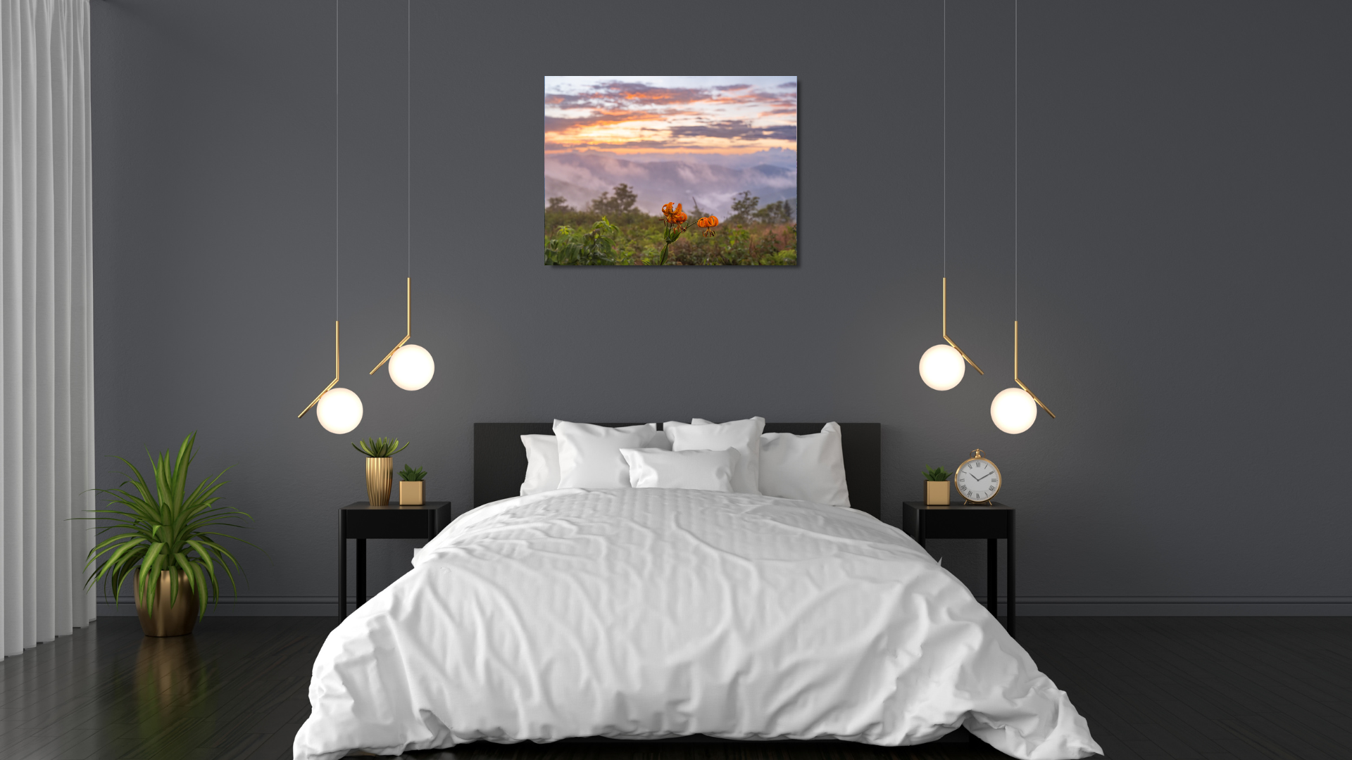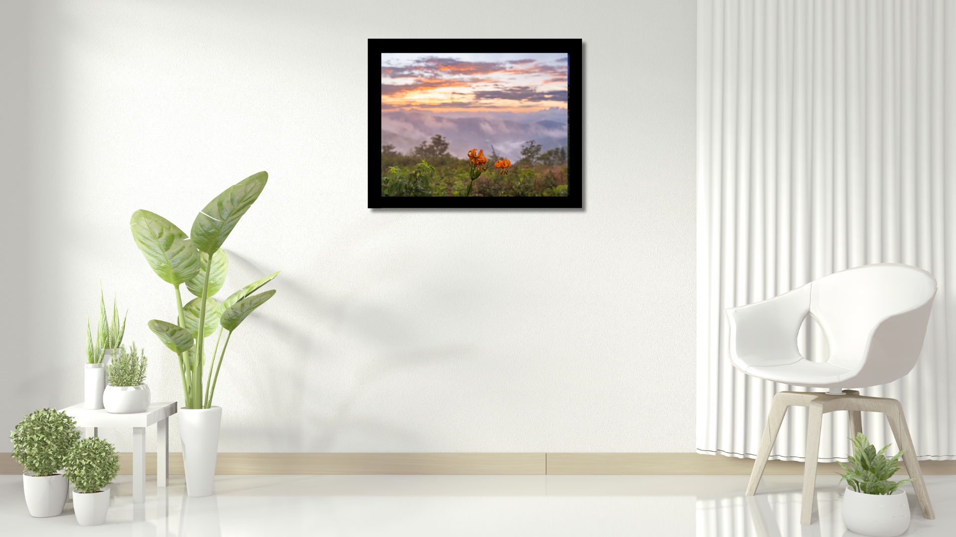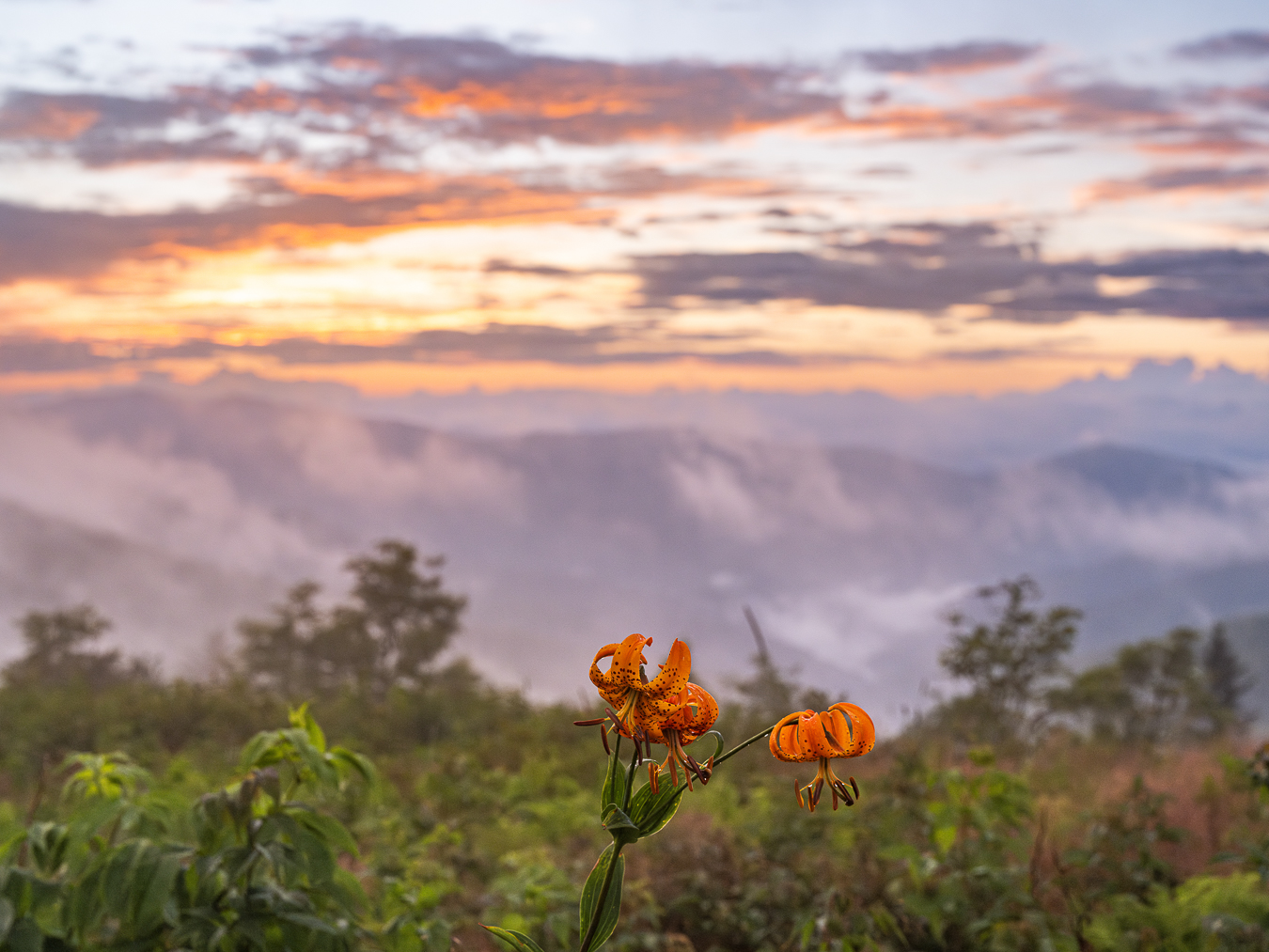 July in the 2025 calendar is a summer sunset in the Blue Ridge Mountains with wild lilies in bloom at high elevation in the frame. Prints available until sold out or January 1st, 2026, whichever comes first!
