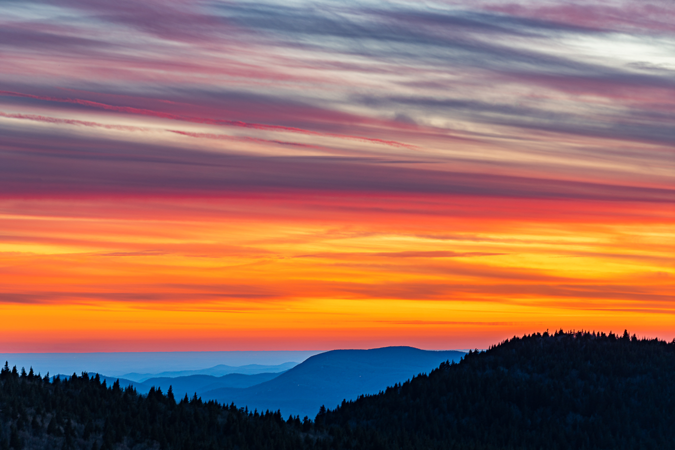 Sunset over Western North Carolina on December 1st, 2022. The color did not last a long time, but was so intense while it did. The blue horizon combines with the orange tones in the most eye-pleasing way possible, in my humble opinion.