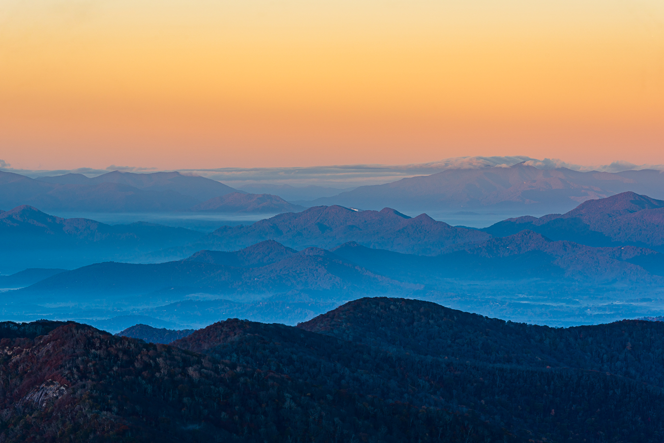 An early morning hike near Craggy Gardens on the Blue Ridge Parkway provided incredible views of a wonderful sunrise, but perhaps my favorite moment was when the alpenglow hit these distant peaks.